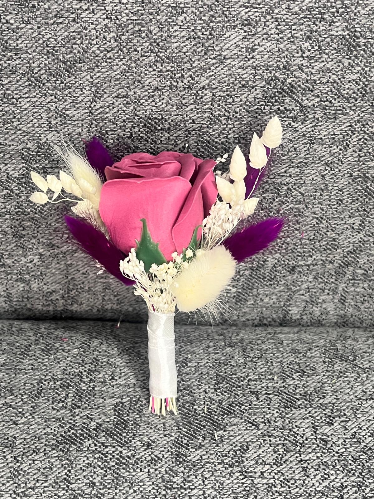 Cocarde din flori si plante naturale uscate sunt deosebite realizate cu atentie la detalii accesorizate cu trandafir ce sunt special concepute pentru a completa tinuta eleganta a invitatilor de la nunta.