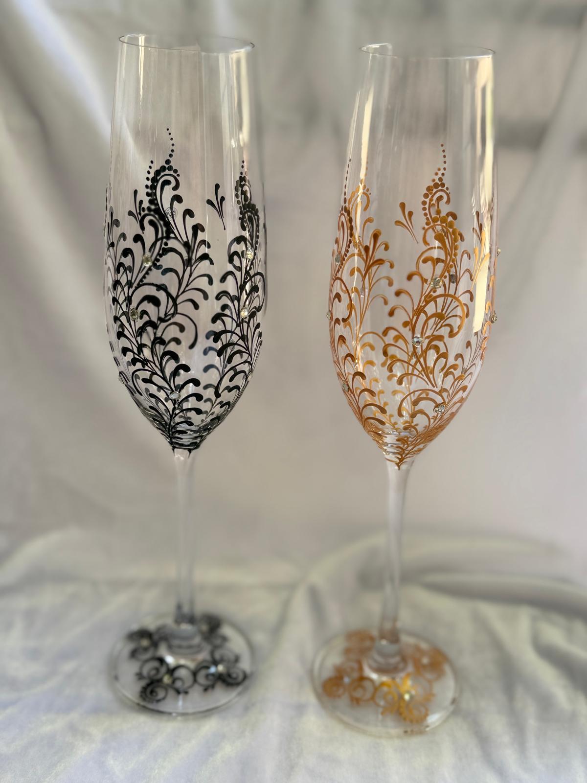 Descoperă paharele dintr o colecție exclusivistă de pahare de șampanie pictate manual, concepută pentru a adăuga un plus de eleganță și strălucire evenimentului tău special. Realizate din materiale premium, aceste pahare îmbină un design sofisticat cu detalii fine, fiind alegerea perfectă pentru toast-uri memorabile la nunți și alte evenimente de lux. Fiecare pahar emană rafinament, transformând fiecare moment într-o sărbătoare a stilului și a eleganței, contribuind la crearea unei atmosfere inconfundabile în ziua cea mare !