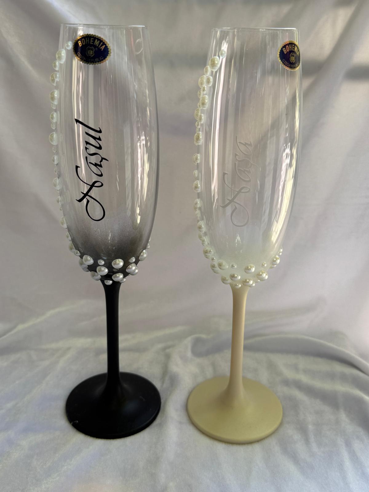 Descoperă paharele dintr o colecție exclusivistă de pahare de șampanie accesorizate cu perle diafane concepută pentru a adăuga un plus de eleganță și strălucire evenimentului tău special. Realizate din materiale premium, aceste pahare îmbină un design sofisticat cu detalii fine, fiind alegerea perfectă pentru toast-uri memorabile la nunți și alte evenimente de lux. Fiecare pahar emană rafinament, transformând fiecare moment într-o sărbătoare a stilului și a eleganței, contribuind la crearea unei atmosfere inconfundabile în ziua cea mare !