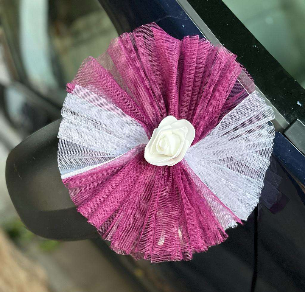 Puff Ciufulit 2 culori este un aranjament handmade, conceput pentru a adăuga un plus de eleganță și originalitate mașinii de nuntă. Realizat din tulle delicat și accesorizat cu un trandafir din spumă, acest ornament oferă un aspect rafinat și festiv vehiculului. Cu o lățime de 20 cm, puff-ul se fixează ușor de oglindă cu ajutorul unui șnur rezistent. Disponibil în două culori.